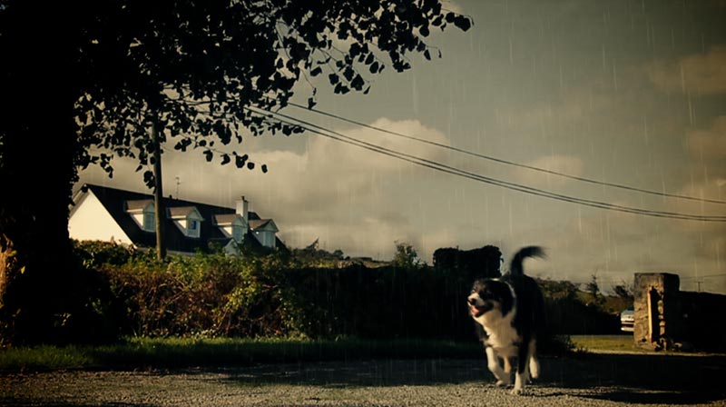 Finally we looked at two scenes in particular that could be improved upon. For the scene that the dog comes running into shot from the drive, being a sunny day there was no rain. We added in rain using a particles plugin called ‘Trapcode Particular‘. The blue sky was cut out and replaced with a duller sky to make the rain more realistic.