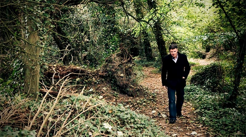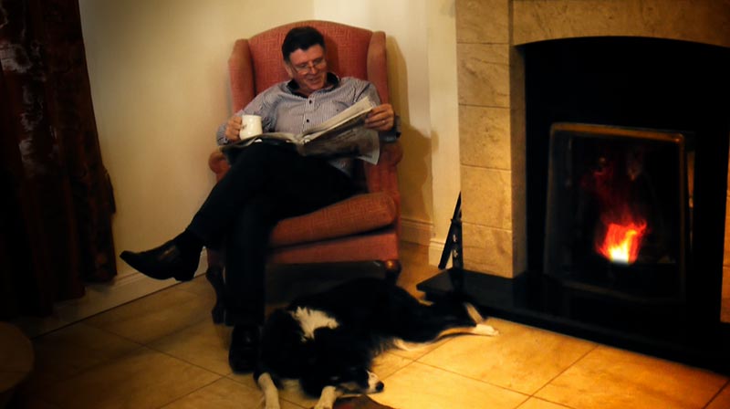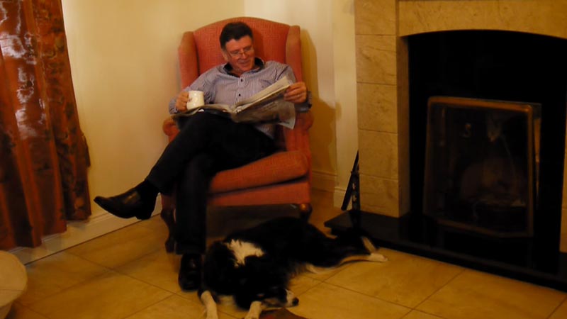 By chance we came across the scene for the woodland walk when getting back in the car. Not one to miss and opportunity, Dermot got the cameras set up and we added an other few minutes into ‘the can’ (old analog film speak). Geoff wanted to get some shots of John walking in an open field with “Buddy”, so we adjourned back to Martin’s brother in laws house to squeeze in some final shots as the light was fading.