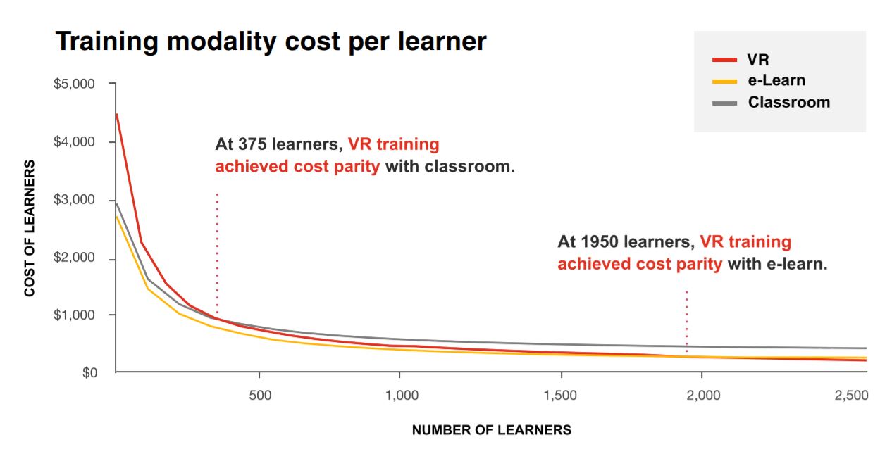From the PWC report we can see that VR-trained learners were up to 4 times more focused during training than their e-learning peers and 1.5 times more focused than their classroom peers. “The largest challenge with the e-learn training was the inability to control learner attention. They could easily be distracted and focus elsewhere during the “watch” portions of the training”. This can also be said of video conferencing. When you think about how VR works, it’s easy to understand why users would be less distracted with this technology: The simulations and immersive experience command their vision and attention.