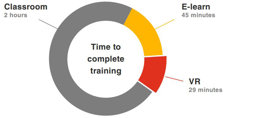 A 2020 PWC report on the effectiveness of Virtual reality training, found that Employees trained using VR completed training faster …four times faster in VR than in the classroom and 1.5 times faster than e-learn. The reports state that employees were: